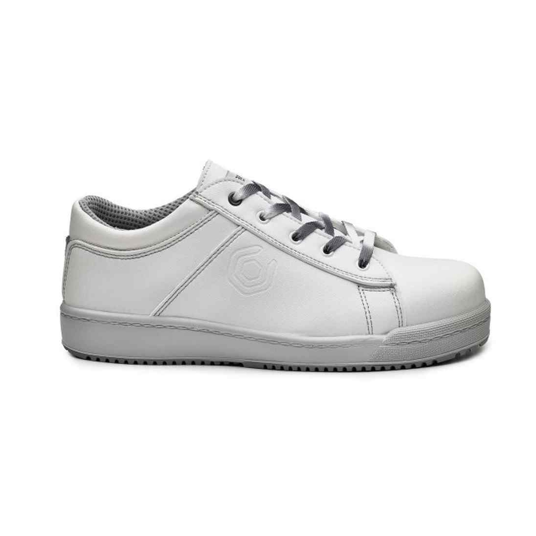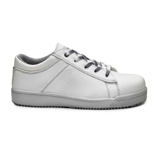 Scarpa bassa in pelle grigia e bianca con puntale in alluminio e suola defaticante. Antibatterico e antiodore, plantare traspirante. Scarpa S3