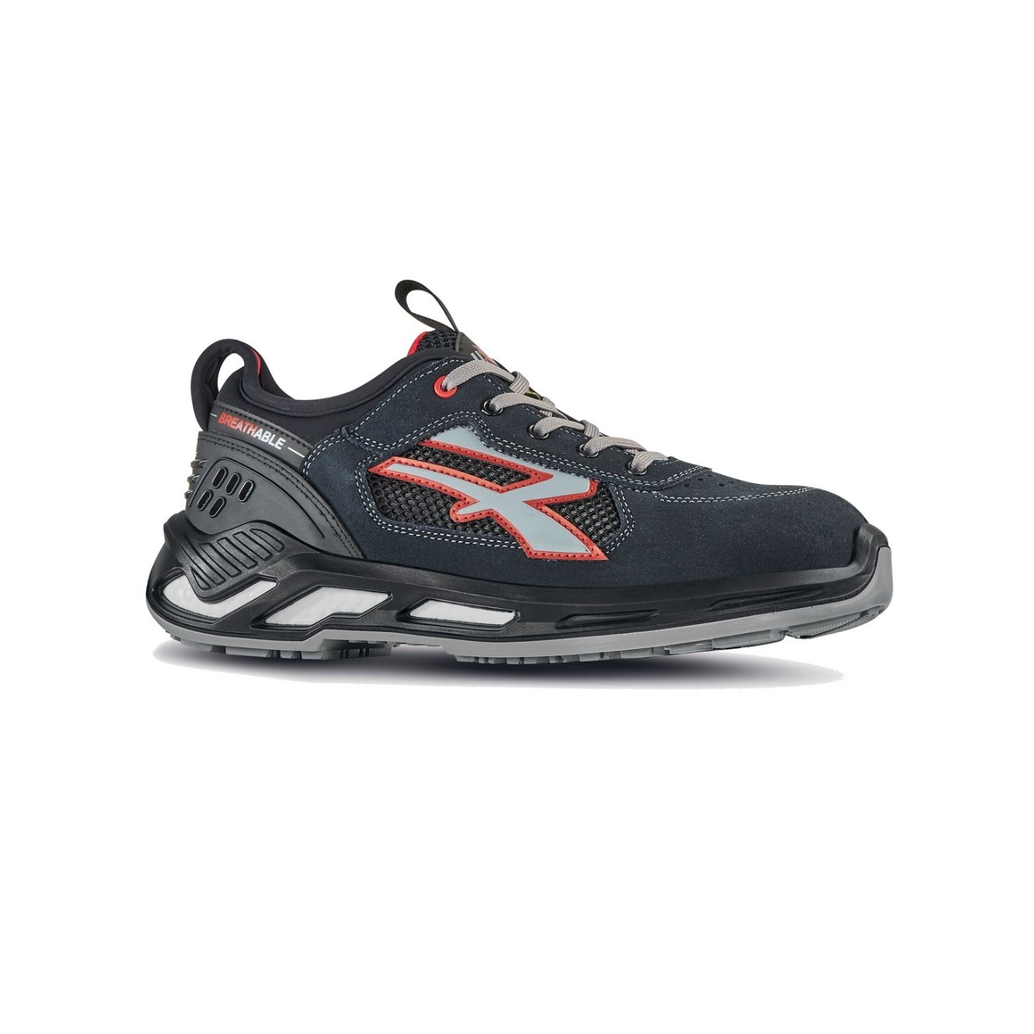 Scarpe antinfortunistiche basse, leggere e comode U-Power della linea Red 360, con tomaia in nylon ultra traspiranti e morbida pelle scamosciata, collarino con tessuto in fibra Lycra®, tallonetta anti-shock, puntale in alluminio, antiperforazione, antiscivolo e suola PU/PU infinergy, S1P SRC ESD