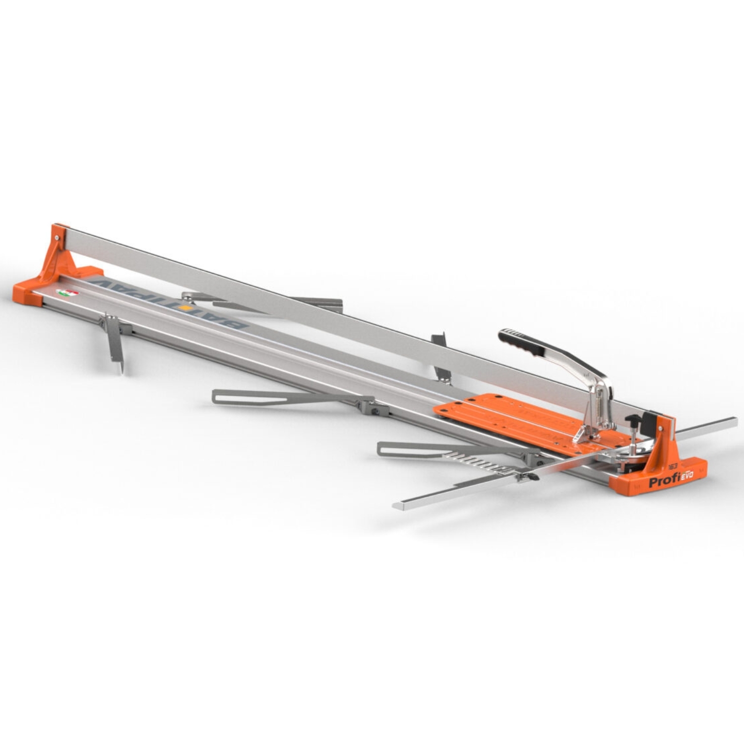 Coupe-carreaux « PUSH » super professionnel pour coupes droites et diagonales de céramique, monocuisson et grès. Longueur de coupe : 163 cm. Équerre rapporteur pour coupe diagonale, réglable de -45° à 0 à +45°.