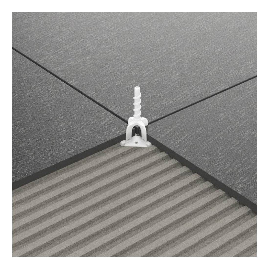- Una base che funge da livellatore (da 1-2-3-5 mm) con rilievi distanziali che permettono di distanziare/separare/ accostare pavimenti di qualsiasi genere e materiale in modo: lineare, a croce e a mezza croce con fughe a scelta.