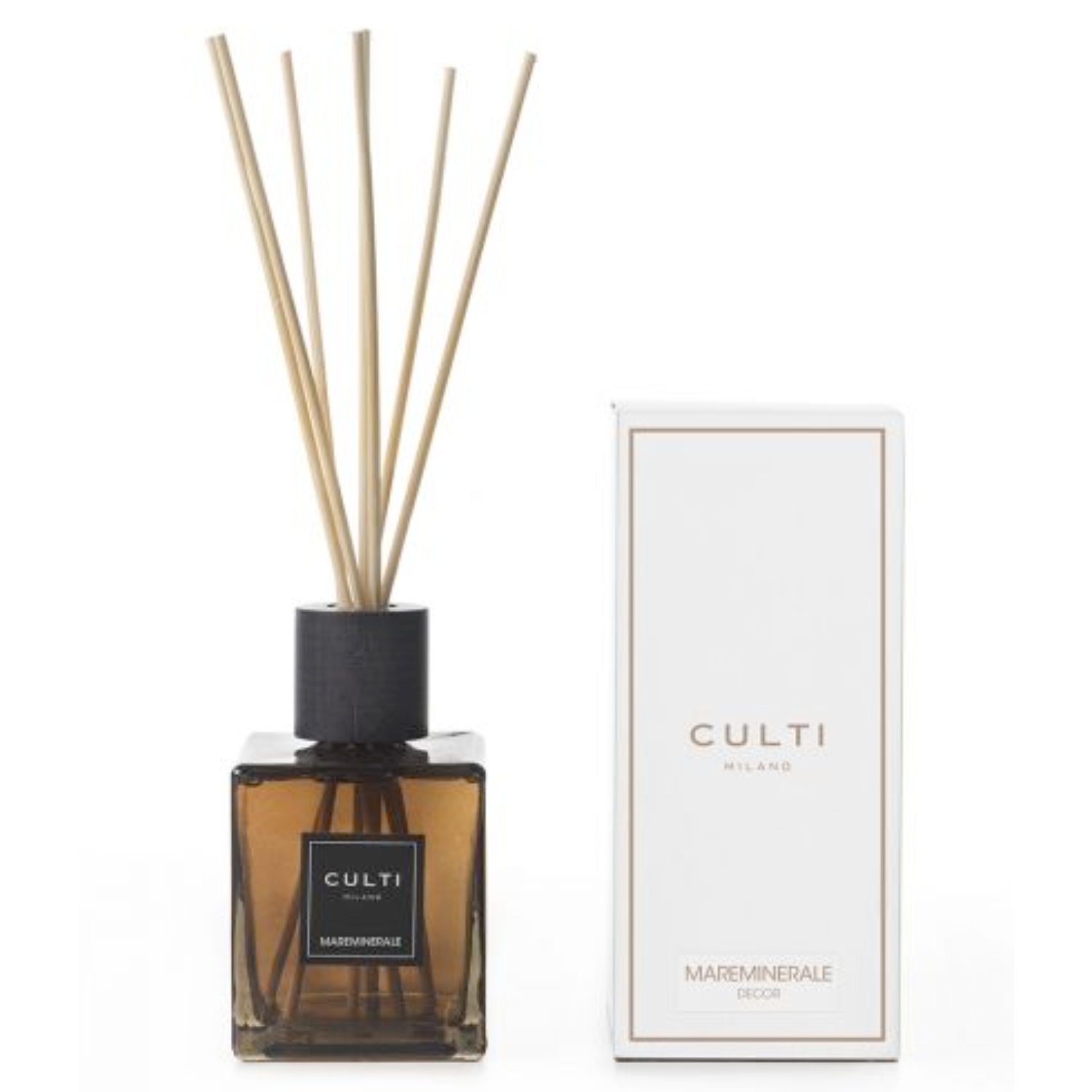 Flaconi scolpiti e squadrati in vetro spesso con tappo in acero verniciato in colore marrone scuro. I tratti netti e decisi della linea CULTI DECOR aggiungono un tocco di carattere agli ambienti. Mareminerale: e’ l’alba sul mare, i passi si appoggiano morbidi sul bagnasciuga, assorbendo l’energia pungente dello iodio e il sentore umido dei legni levigati dal dondolio delle onde. Il vigore di una passeggiata all’alba sulla battigia.