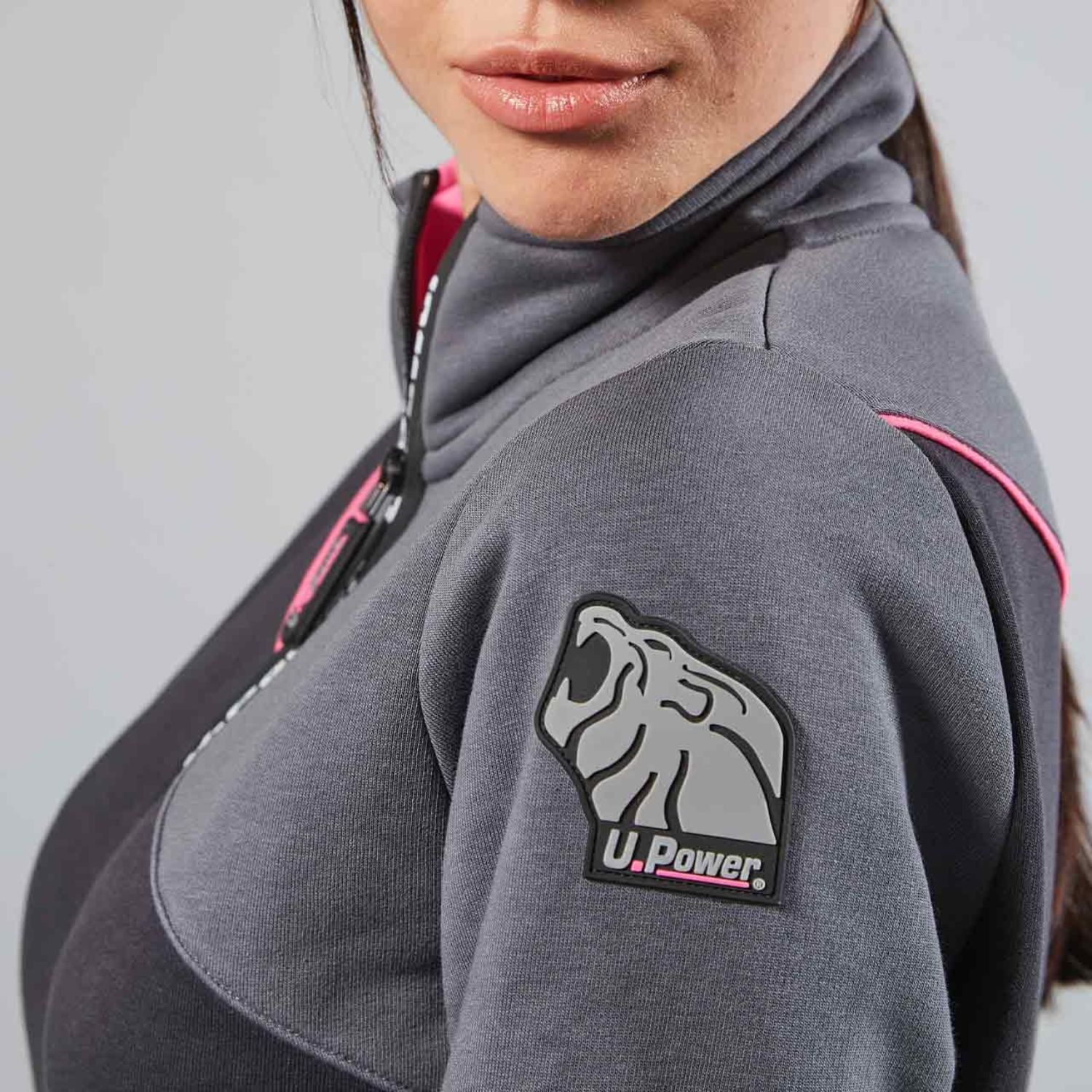 Sweat-shirt de travail pour femme avec zip central imperméable enrichi de la sérigraphie "U-Power". Sweat-shirt gris avec empiècements passepoil élastiqué fluo fuchsia.