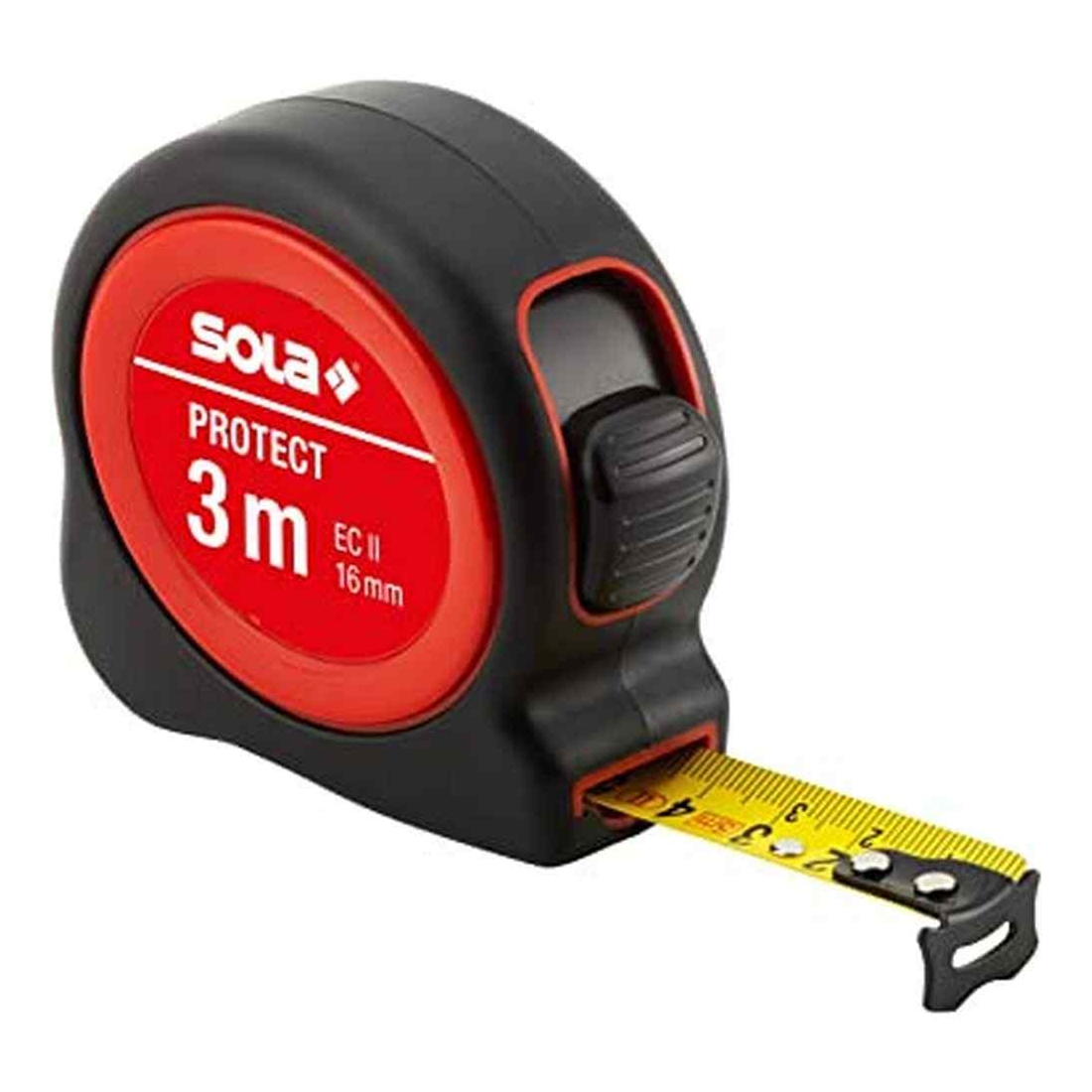 Metro a nastro da 3 metri Protect con cassa in plastica Sola. Gancio terminale magnetico. Precisione duratura e protezione da danneggiamento. Clip per cintura in acciaio resistente per una tenuta maggiore.