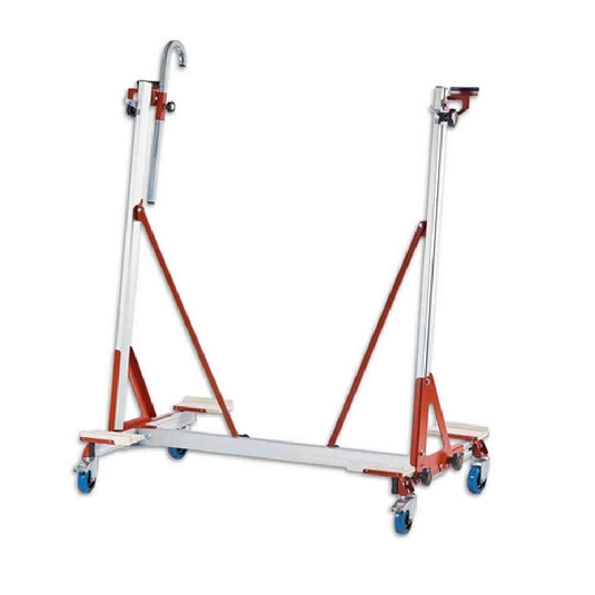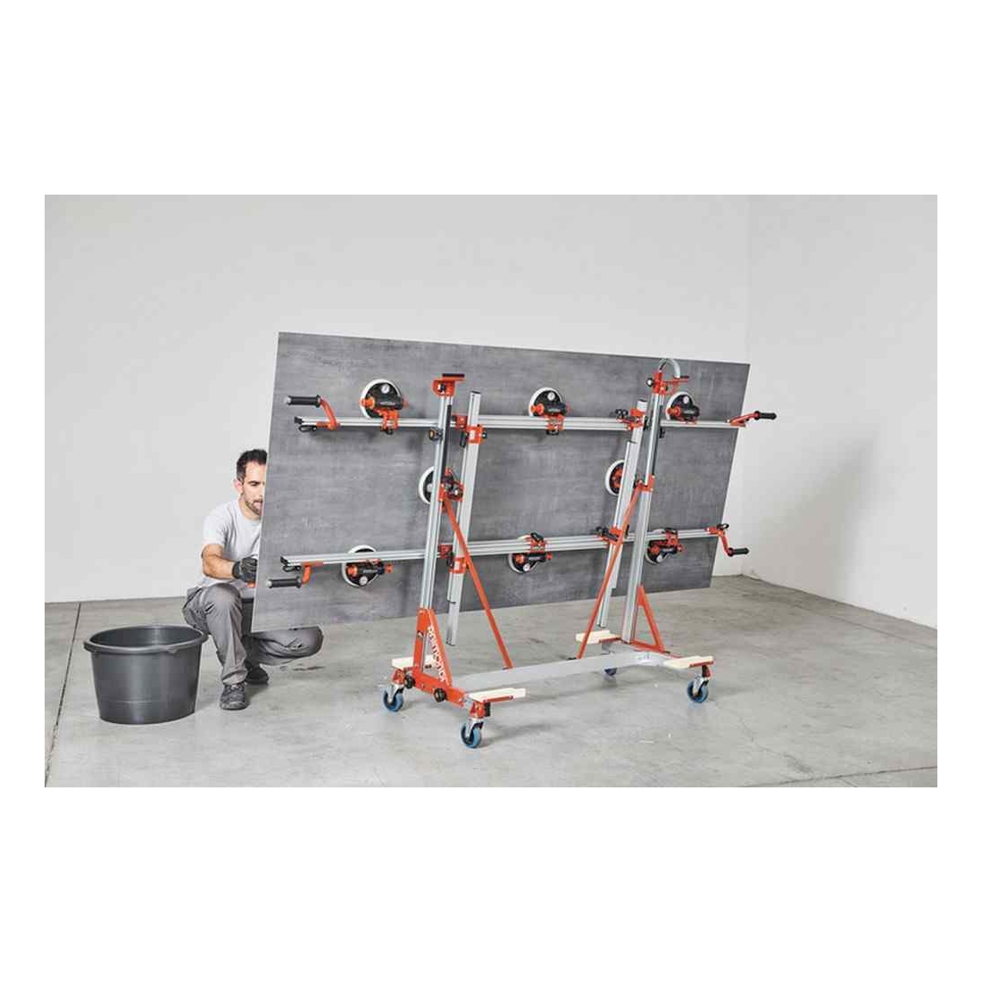 Carrello per il trasporto e la movimentazione di grandi lastre e dispositivi di movimentazione. Leggero (20,4 kg) e facilmente smontabile per la massima praticità d'utilizzo e per ridurre al minimo l'ingombro per il trasporto. Ideale per effettuare l'operazione di spalmatura dell'adesivo sul retro della lastra agevolmente ed in totale sicurezza. A questo scopo è munito di due ganci ad altezza regolabile atti a sostenere i dispositivi di movimentazinoe con la lastra di presa.