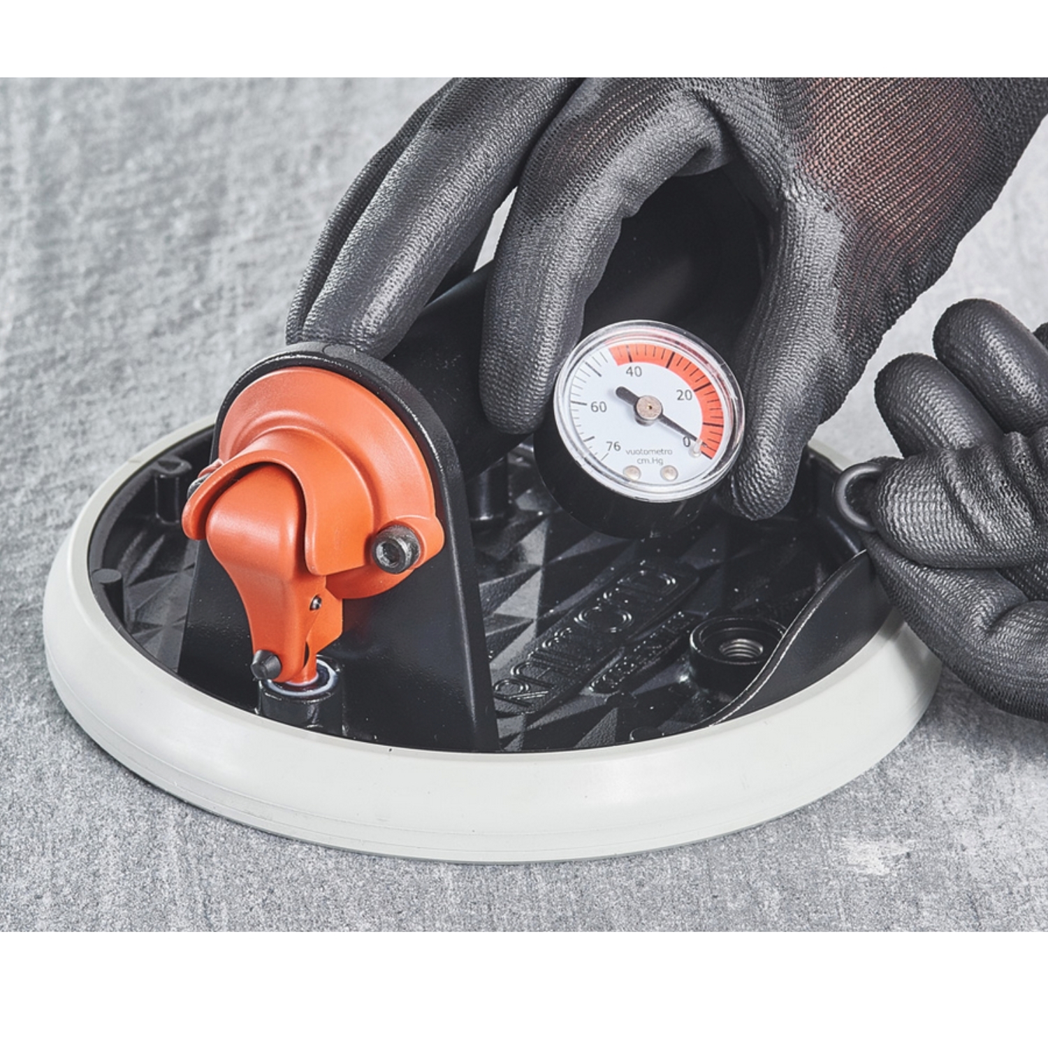 Ventouse "vacuum" RV 175 avec vide-mètre conçu pour la manutention de carreaux, marbres, granits, verre et dalles céramiques en offrant une adhérence parfaite même sur des carreaux structurés.