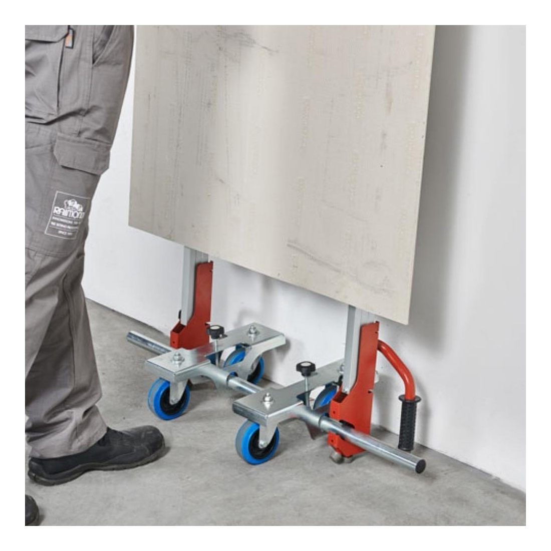 Dispositivo di ausilio alla posa di piastrelle di grande formato. Su formati fino a 150 x 150 può consentire ad un solo operatore di prelevare la piastrella o lastra da terra, di trasportarla fino all'area da pavimentare, di eseguire la spalmatura dell'adesivo sul retro e di posarla accostandola alla piastrella/lastra già posata.