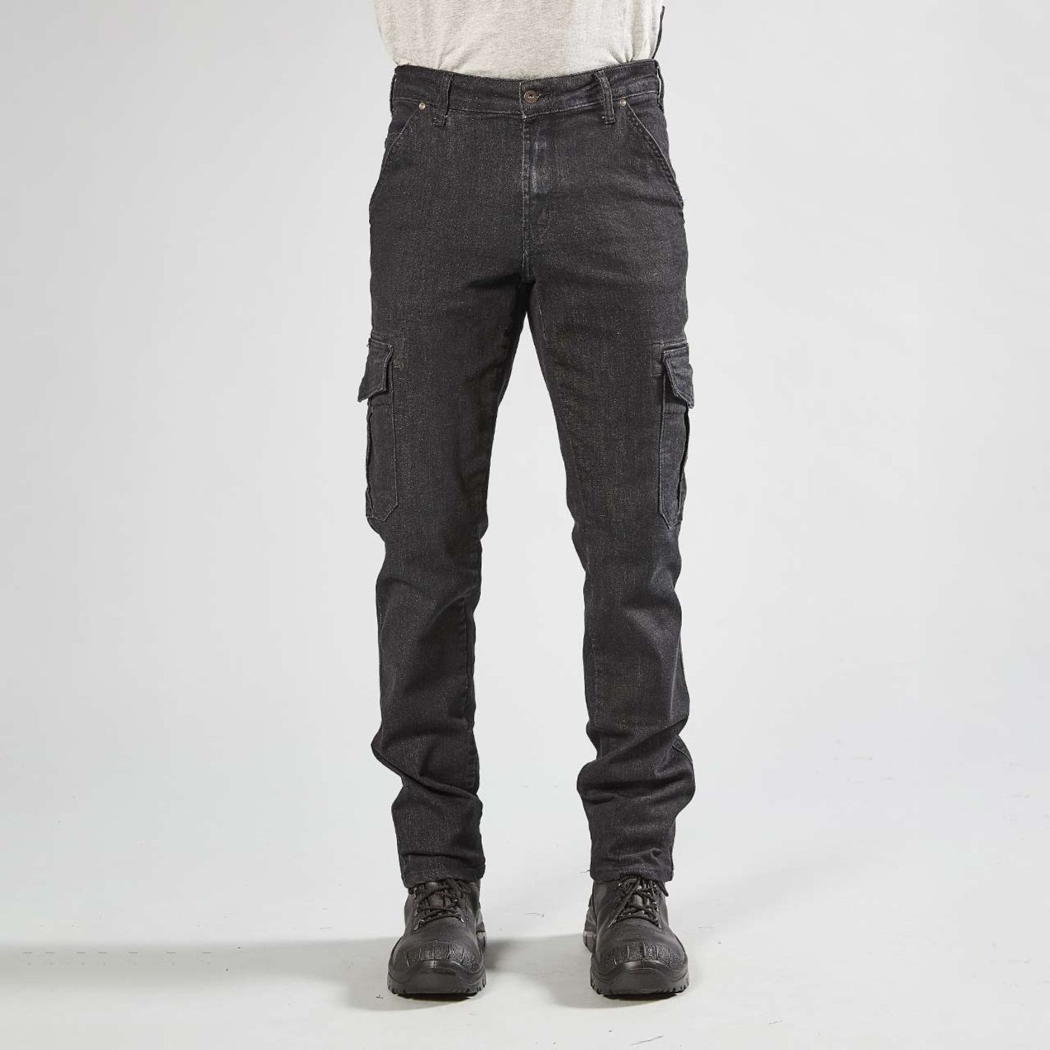Jean cargo de travail en tissu stretch avec deux grandes poches latérales avec boutons-pression et trous pour porte-stylos
