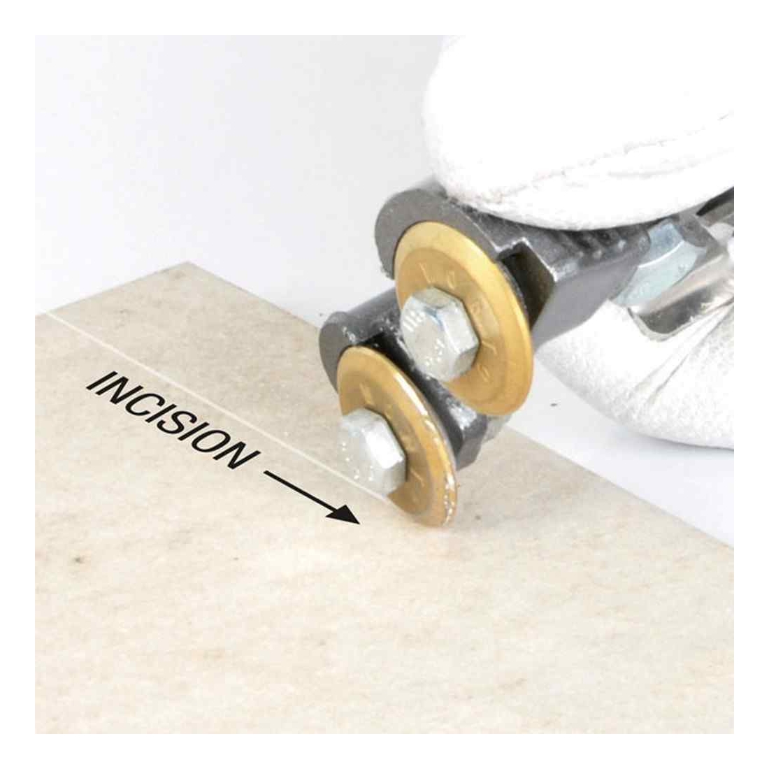 I taglienti sono costituiti da due speciali rotelle in carburo di tungsteno con rivestimento in Nitruro di Titanio che garantiscono risultati eccellenti sulle ceramiche più dure e con spessori fino a 15 mm, che una precisione di taglio per lavorazioni accurate di finitura su materiali particolarmente delicati.