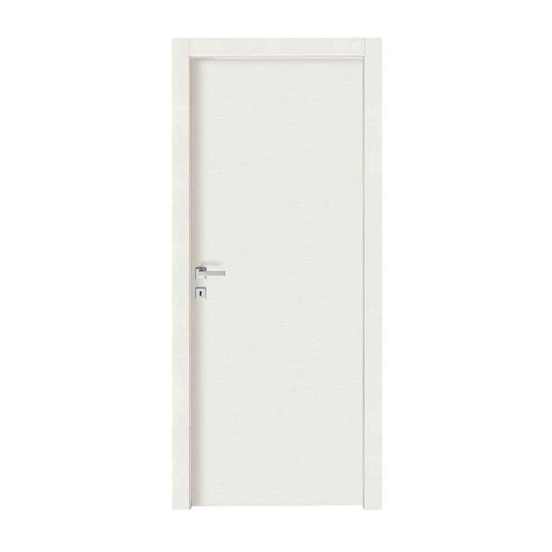 La porta battente fa parte della linea Comfort nella variante liscia Prima di Scrigno nel colore venato bianco.