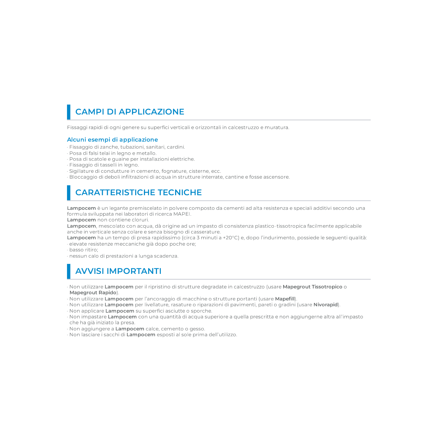 - Per applicazioni in verticale, Lampocem aderisce senza colature.