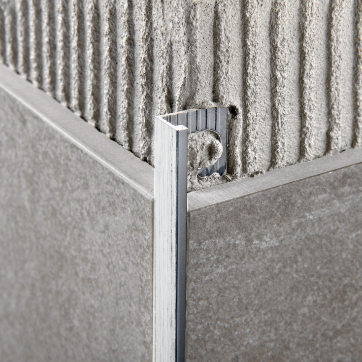 Profilo in alluminio spazzolato brillantato argento 270 cm a forma di “L” idoneo a proteggere gli angoli esterni dei rivestimenti e per la loro chiusura perimetrale.