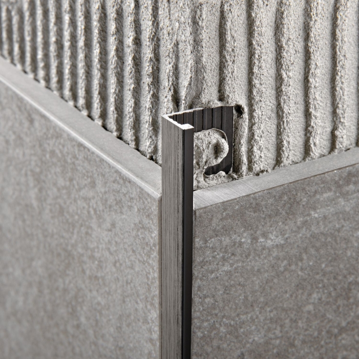 Profilo in alluminio spazzolato brillantato nero 270 cm a forma di “L” idoneo a proteggere gli angoli esterni dei rivestimenti e per la loro chiusura perimetrale.