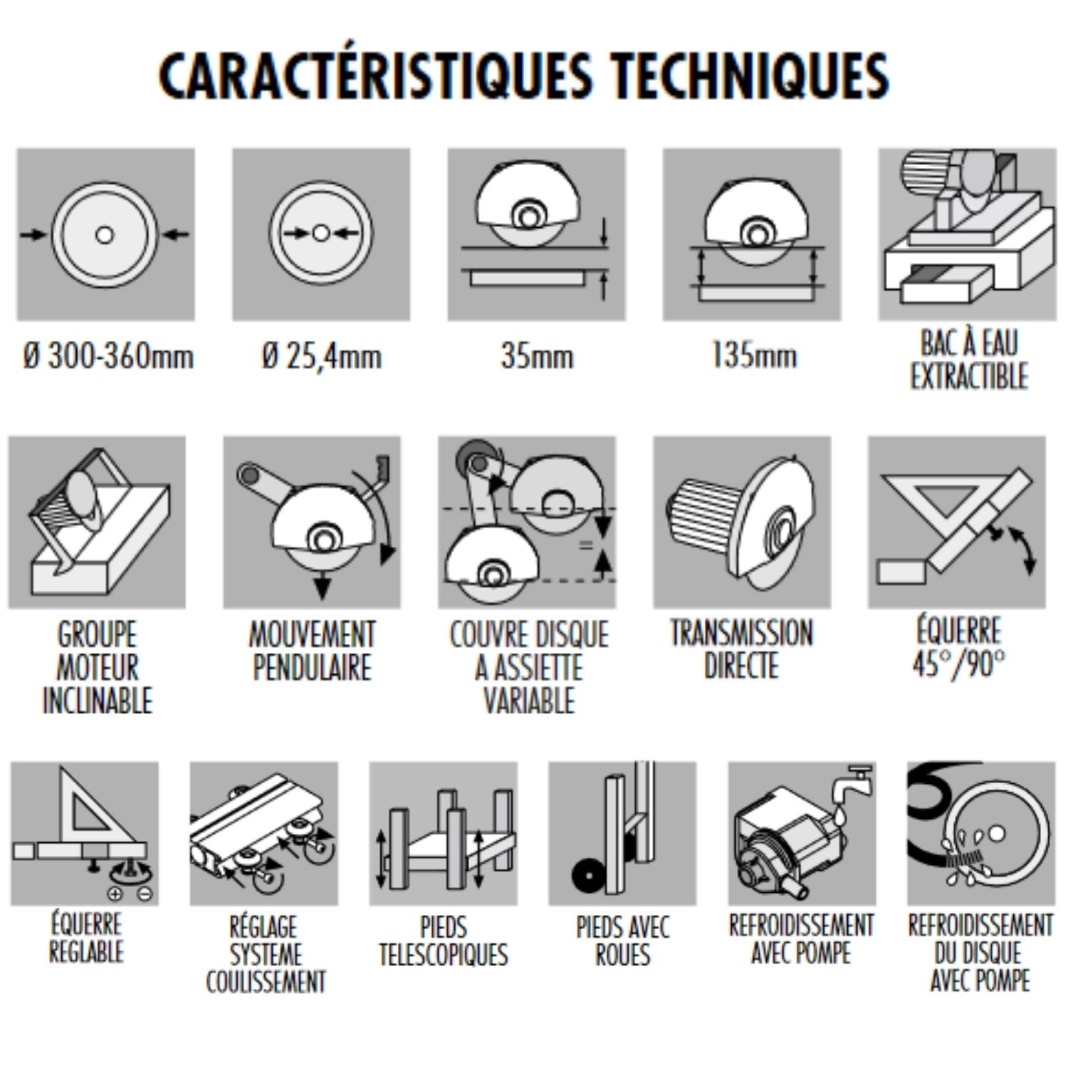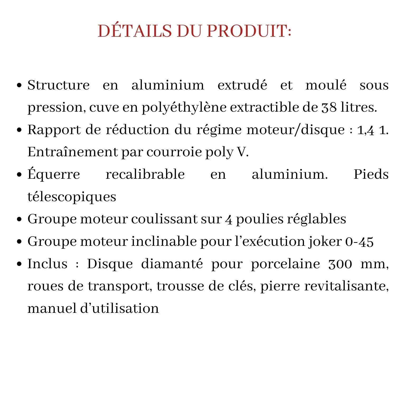 - Livrée avec 1 disque Ø 350 mm pour le grès cérame, roues pour le transport, jeu de clés, pierre de ravivage, manuel d’utilisation et d’entretien